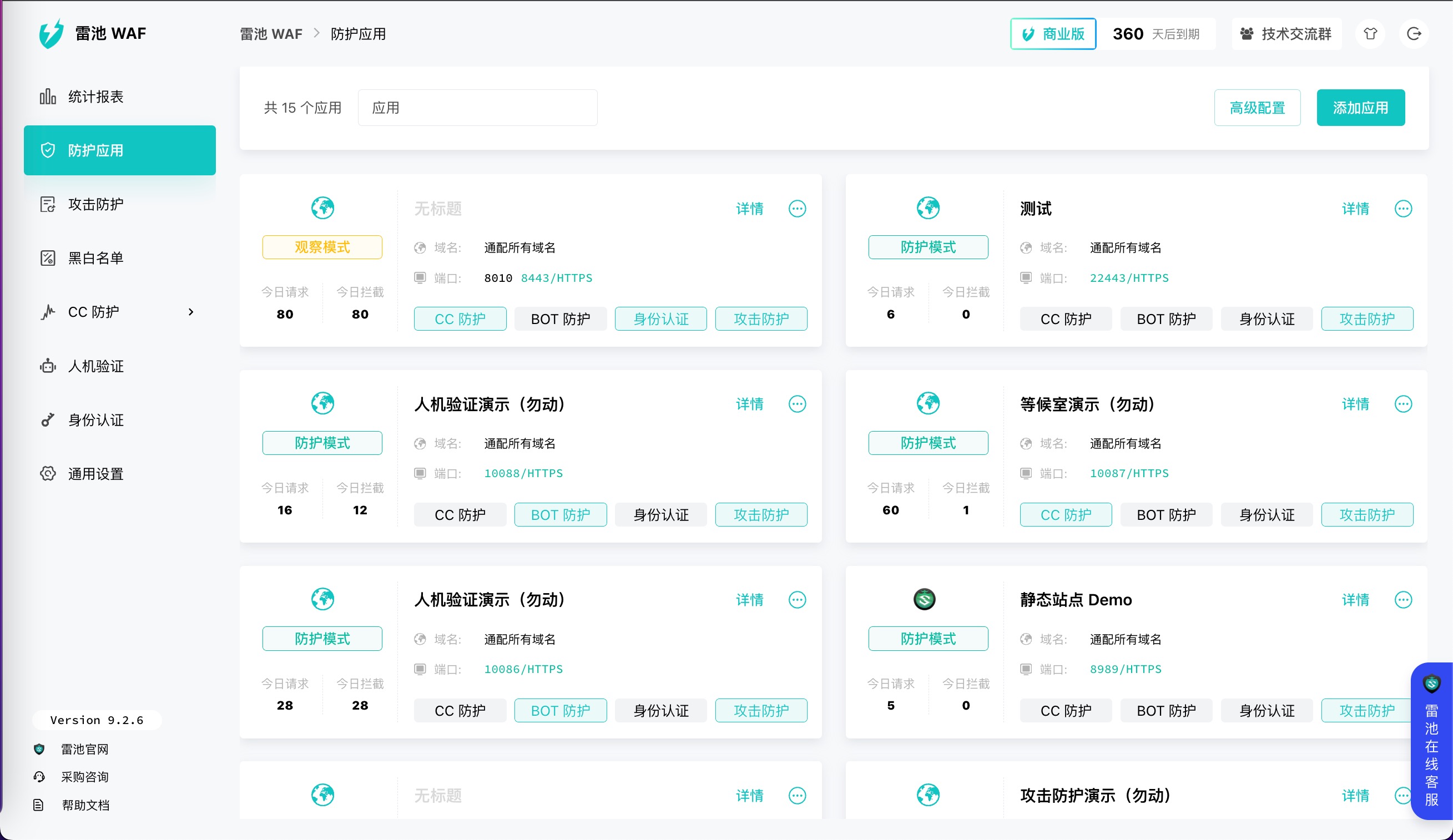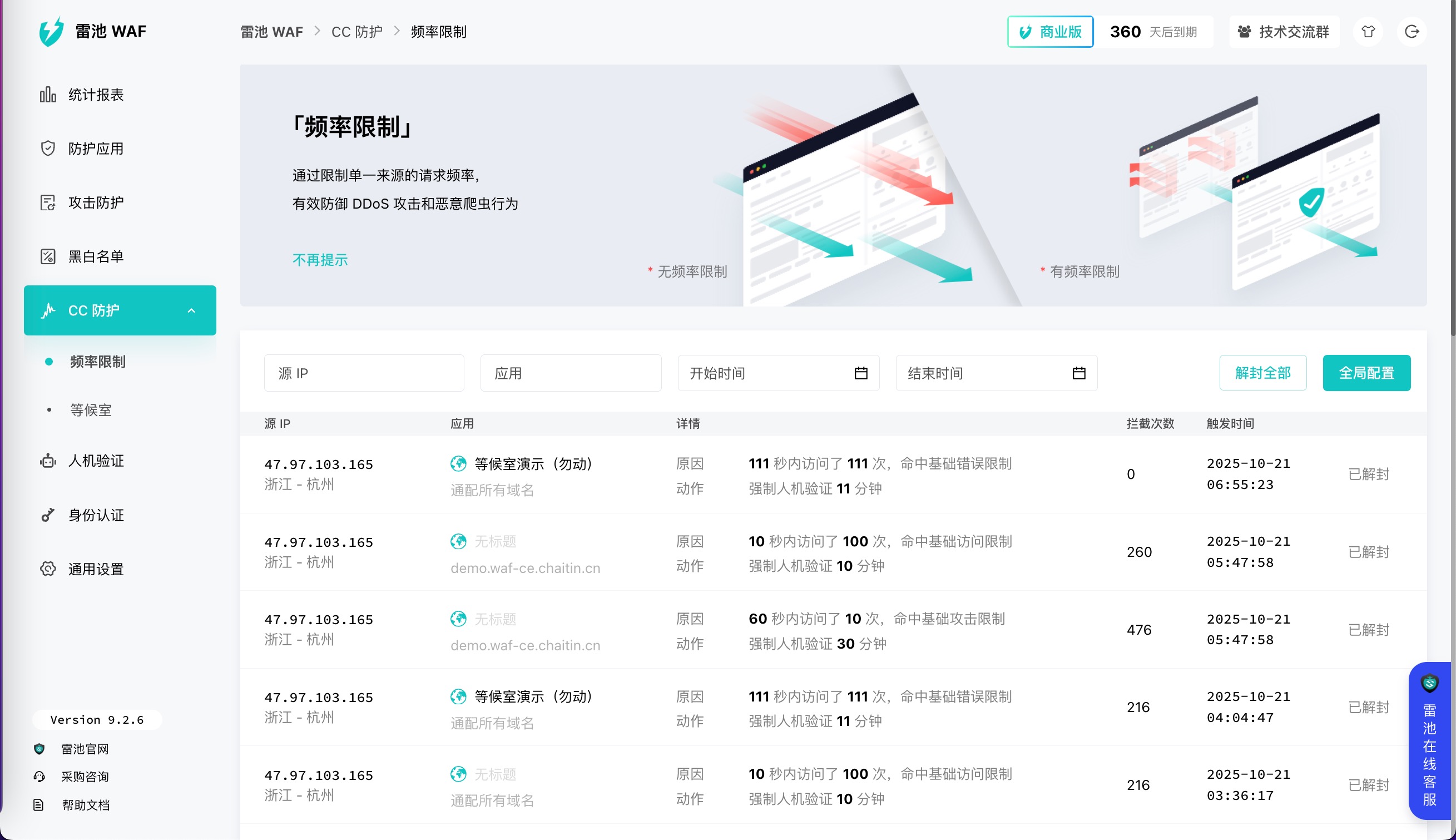 雷池WAF提供高级防护能力,包括语义分析算法(深度解码HTTP载荷)、Bot防护(人机验证、动态防护、防重放)、CC防护(频率限制、等候室)、身份认证和威胁情报IP识别,有效防御各类网络攻击。